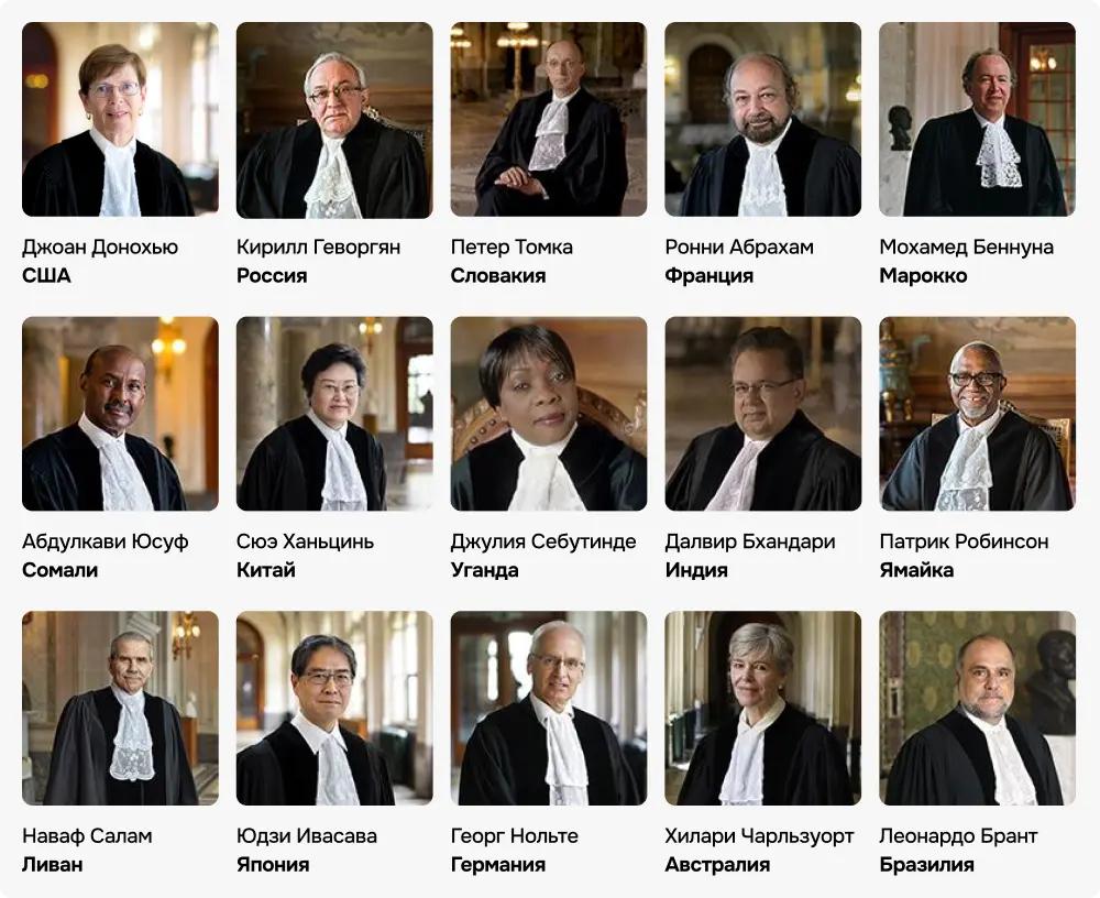 Согласно уставу Международного суда ООН, к коллегии в конкретном процессе может также присоединиться судья, делегированный как государством-ответчиком, так и государством-истцом. Потому в этом деле также участвуют судьи представители от Израиля и ЮАР.