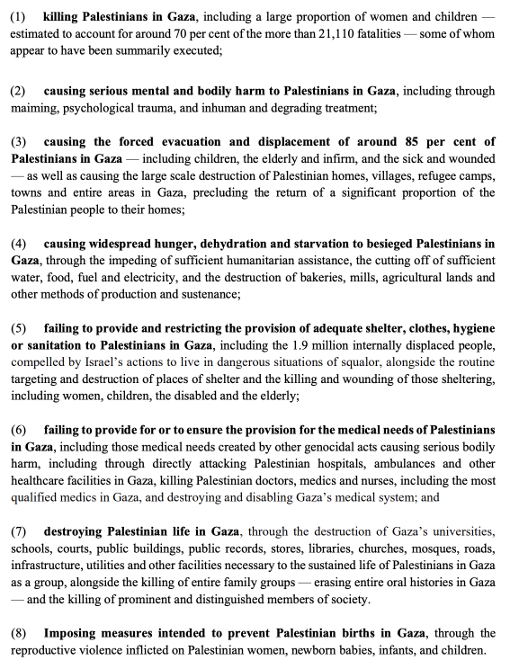 В качестве действий обвинение приводит данные о погибших и пропавших без вести в секторе Газа, большие разрушения и тяжелую гуманитарную ситуацию (список обвинений). Также иск полагается на мнения из отчетов разных лет, обвиняющих Израиль в несоблюдении правил ведения войны.