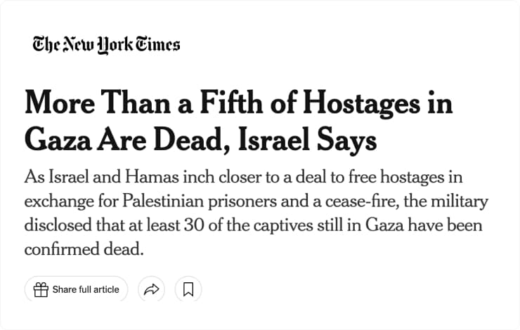 Несколько дней назад New York Times выпустили статью со ссылкой на анонимные источники в израильской разведке, согласно которой 32 из 136 находящихся в плену ХАМАС заложников были убиты.