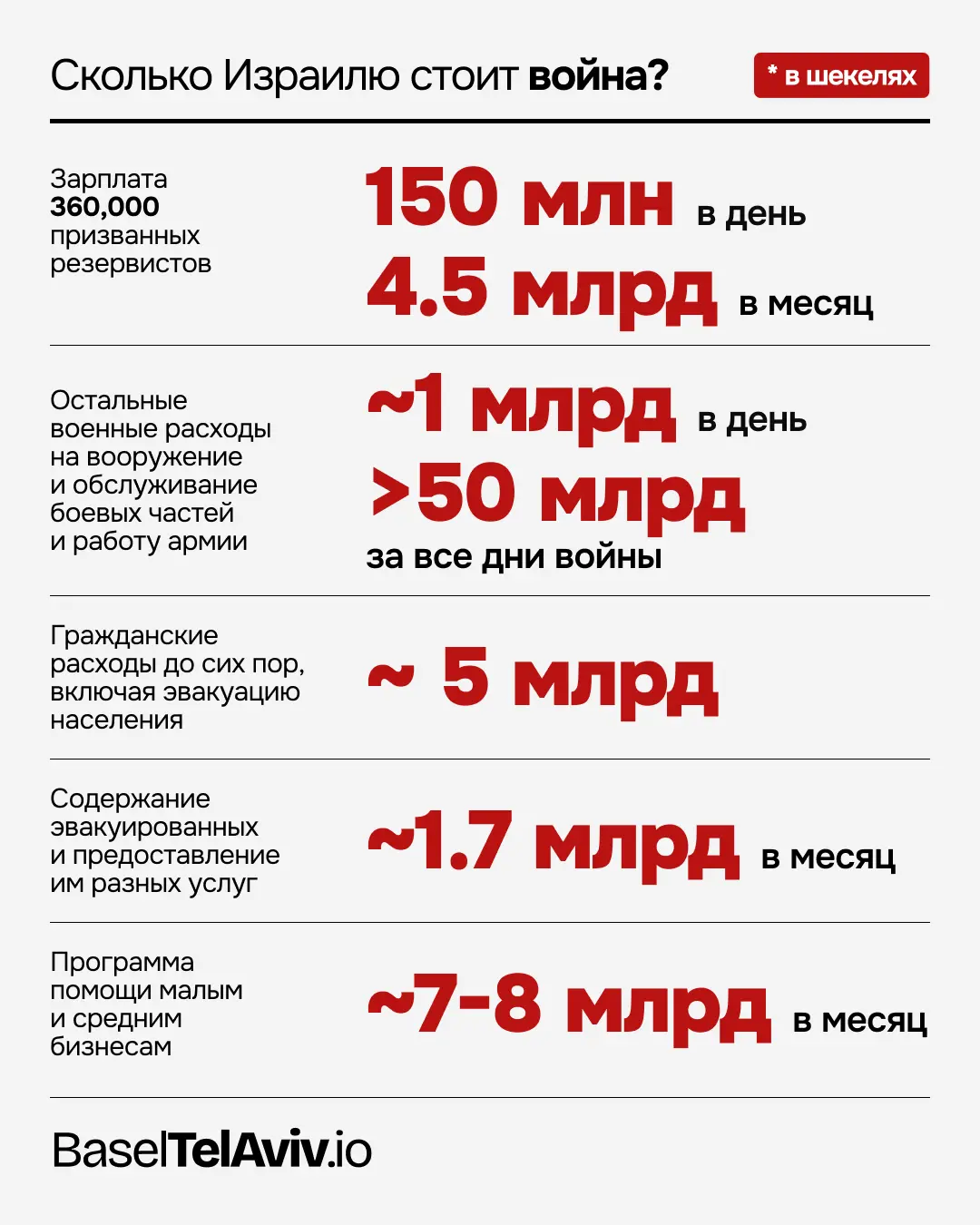Зарплата 360,000 призванных резервистов на время призыва (уже почти на 2 месяца) выплачивается армией в дополнение к обычному бюджету на ежегодный призыв резервистов. Только эта статья обходится в ₪150 миллионов в день или ₪4,5 млрд в месяц – почти процент от годичного бюджета.