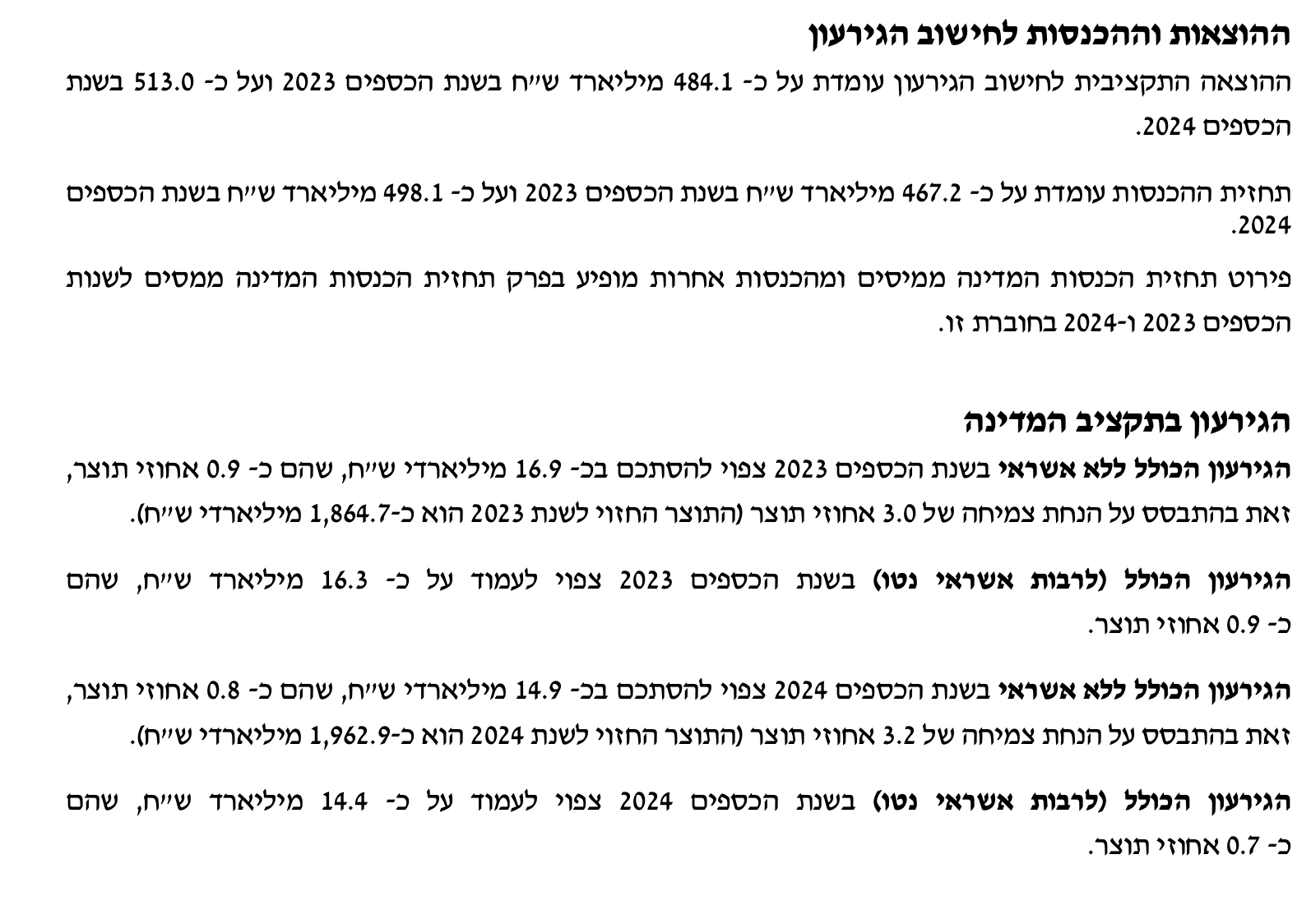 Пример в 2023 году планировалось потратить ₪484.1 млрд, прогноз по доходам составлял ₪467.2 млрд, а разница (дефицит) – ₪16.9 млрд – обычно покрывается за счет различных долговых инструментов.