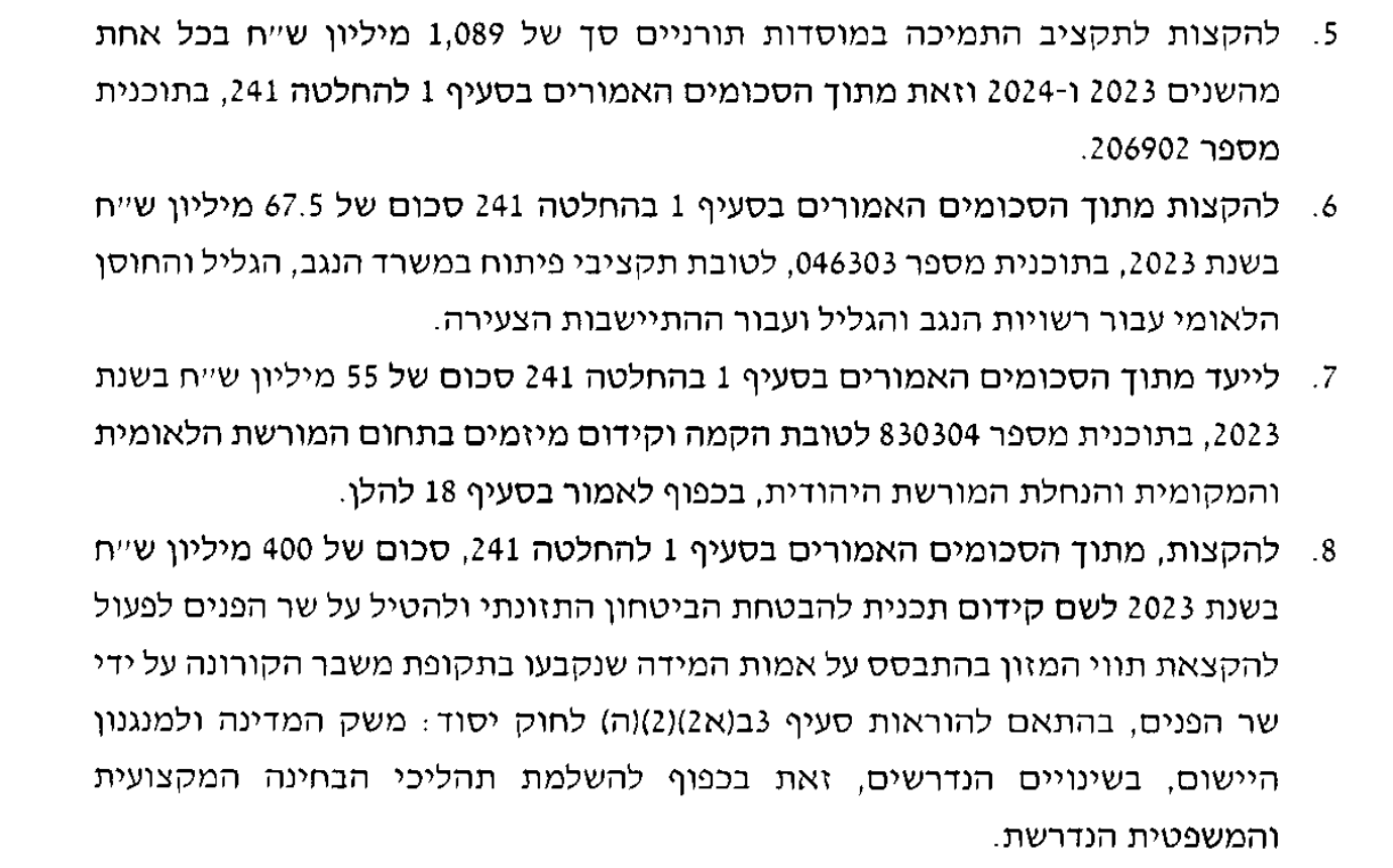 Также документ приводит целый ряд обновленных бюджетов на различные проекты, которые будут профинансированы. Среди них есть как действительно соотвествующие духу времени: бюджеты, направленные на усиление безопасности и поддержку организаций медицинской и прочей помощи населению или же полезные экономически инициативы, например курсы проф. подготовки в ультра-ортодоксальном секторе, так и направления, вызывающие вопросы о своевременности или лишенные всякой прозрачности.