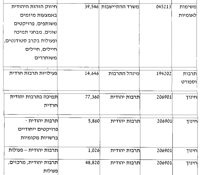Например, бюджет на “укрепление еврейской идентичности через совместные предприятия, различные проекты, поддержку акций среди студентов и солдат” был снижен с изначальных ₪134 млн, но все еще составляет ₪39 млн, ₪77 млн пойдут на “поддержку еврейской ультра-ортодоксальной культуры” и отдельно ₪14 млн на “мероприятия ультра-ортодоксальной культуры”, отдельно ₪55 млн на “еврейскую культуру” и много других примеров с разными более и менее крупными бюджетами.