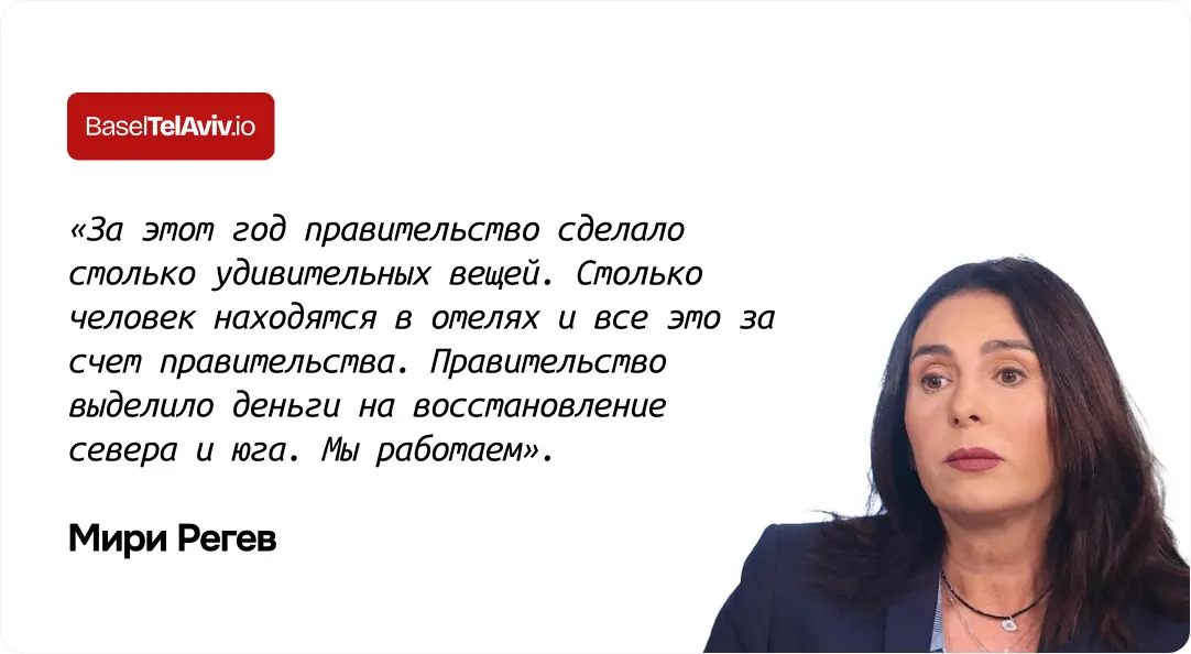 Да, открыто полицейское разбирательство по подозрению в коррупции, но Мири Регев продолжает свою работу, продолжает давать интервью и даже умудряется гордиться тем, что правительство оплачивает отели для эвакуированных из зон военных действий, хотя это прямая обязанность государства. И говорит об этом Регев ровно тогда, когда терпение эвакуированного населения подходит к концу, ведь пребывание 8 месяцев вне дома и привычной жизни абсолютно для каждого – это очевидная пытка.