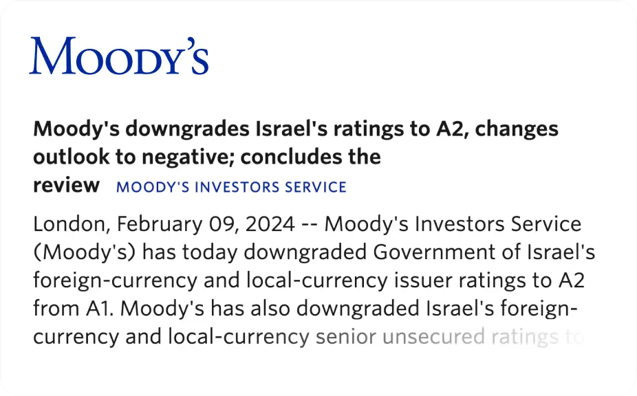 9 февраля одно из трех ведущих международных рейтинговых агенств Moody’s опубликовало отчет и снизило кредитный рейтинг Израиля с А1 на A2 с отрицательным прогнозом.