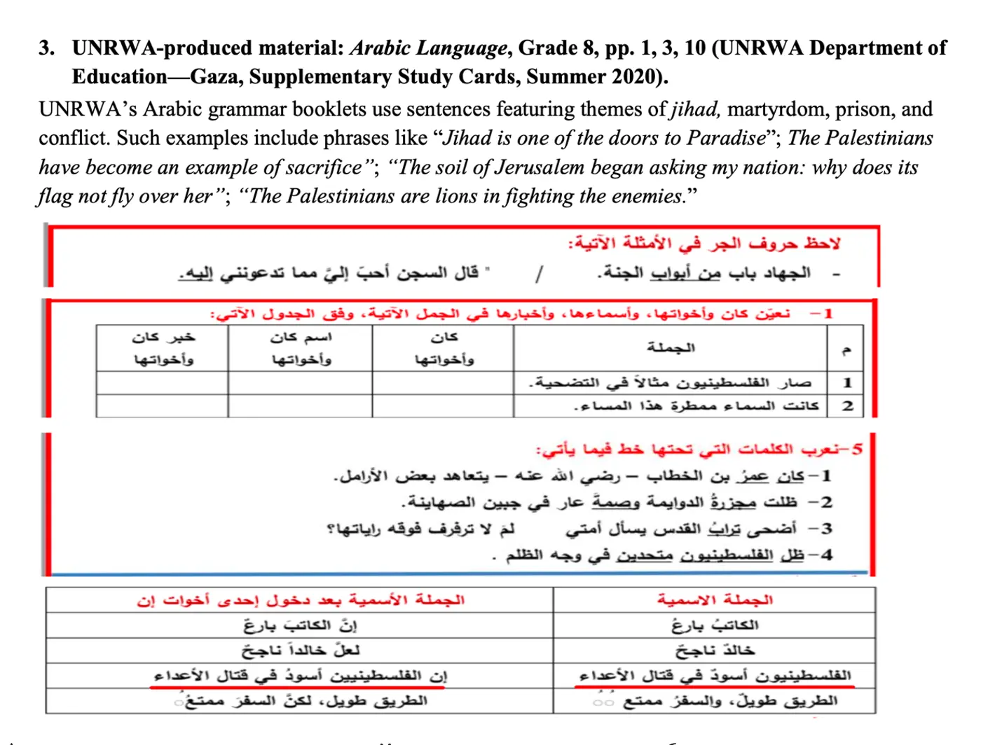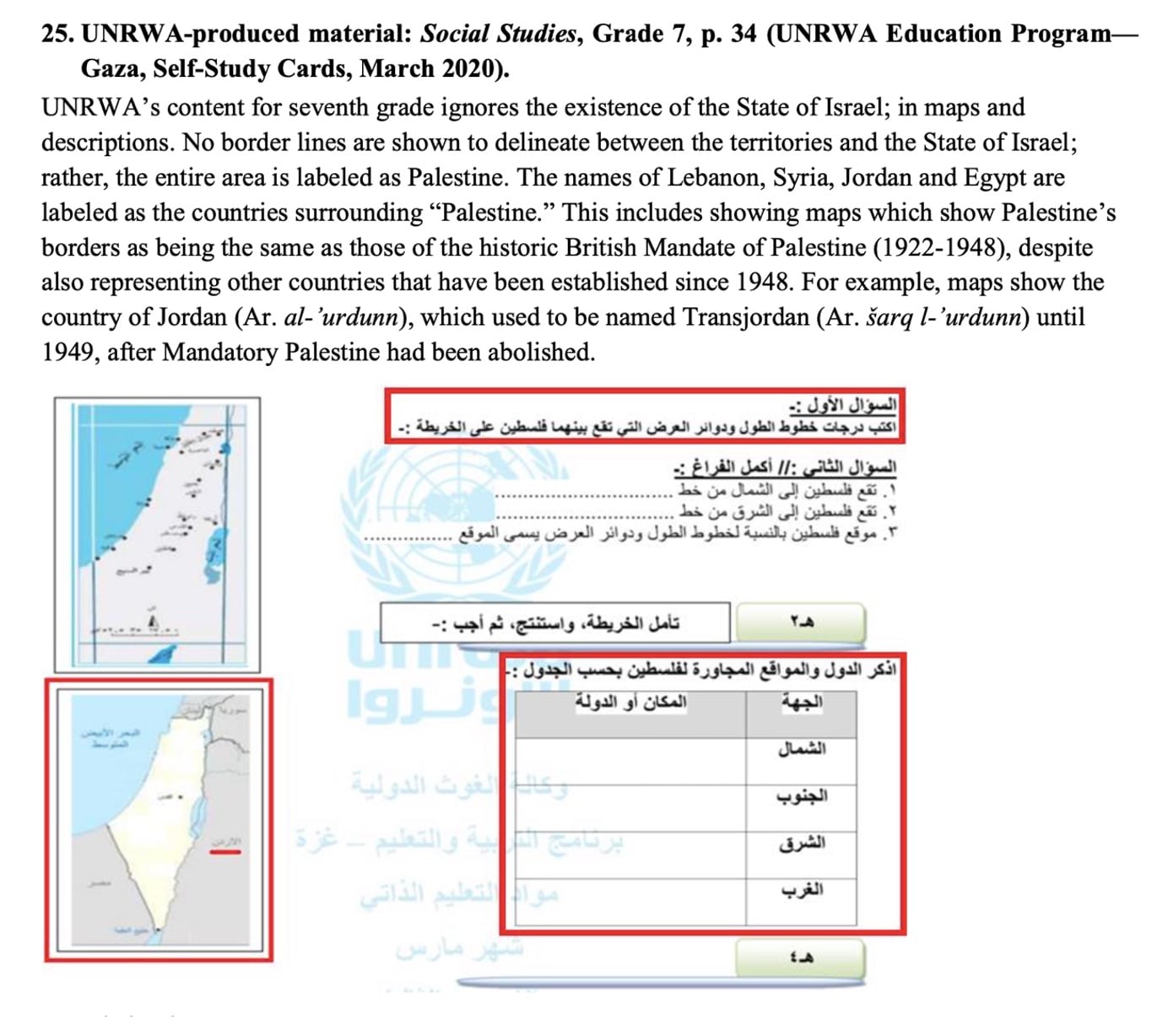 As part of its education reforms in 2011, UNRWA launched an initiative to promote “alternative learning methods,” including but not limited to self-learning, to enable students to continue learning during emergencies such as armed conflict. UNRWA’s first “Self-Study Cards” became available in 2020. IMPACT-se also researched them and found them to be almost identical to materials in other Palestinian textbooks.