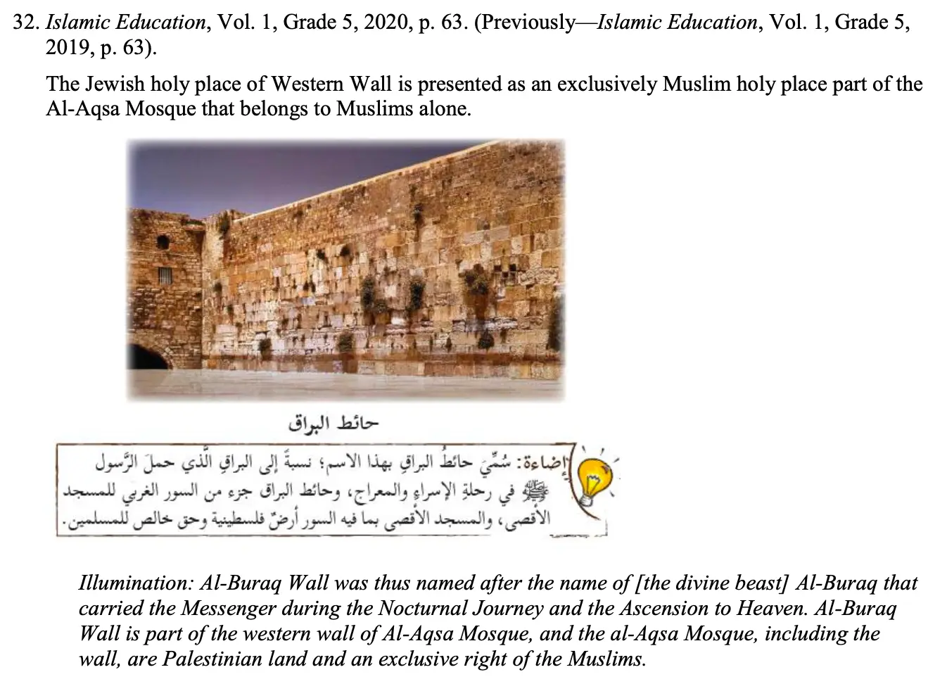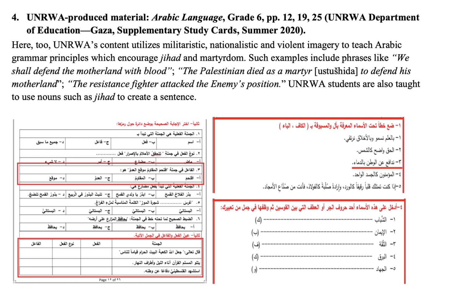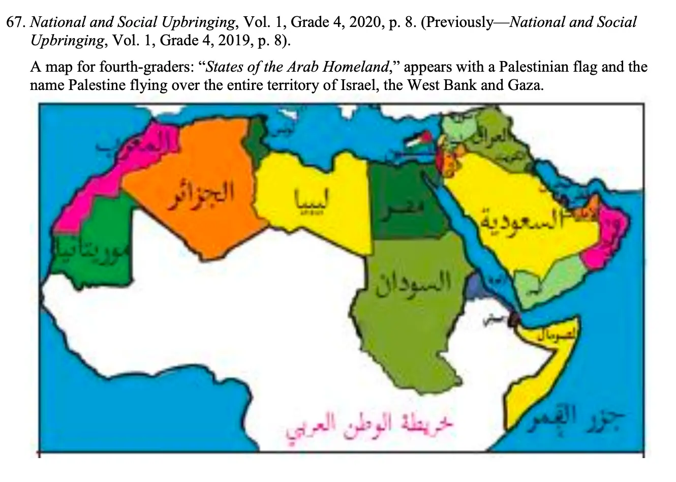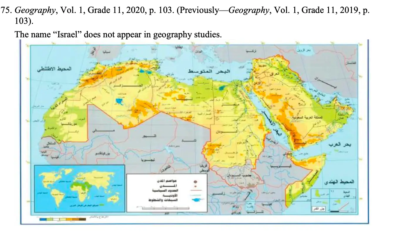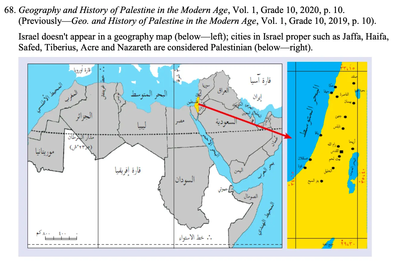 “Our extensive study of PA schoolbooks has consistently shown the systematic inclusion of ideas of violence, martyrdom, and jihad in textbooks across all subjects and grades, as well as the propagation of extreme nationalism and Islamist ideologies throughout the curriculum, including textbooks on science and mathematics; rejection of the possibility of peace with Israel; and the complete omission of any mention of historical Jewish presence in modern Israeli and Palestinian territories.”