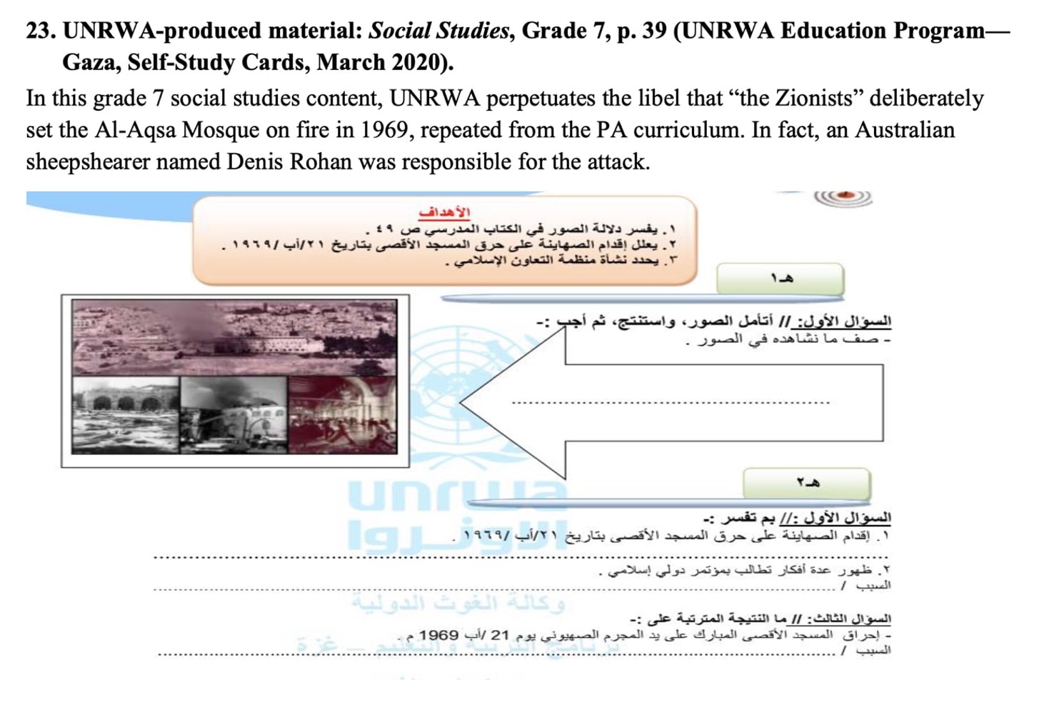 The UNRWA also allows knowingly false information in its cards, such as blaming Israel for the 1969 arson attack on the Al-Aqsa Mosque, even though it has been proven that an Australian Christian, Denis Rohan, was responsible for the attack.