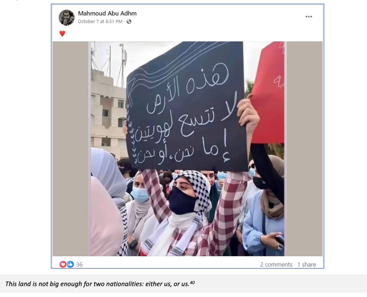 Mahmoud Abu Adhm is a civil engineer and UNRWA employee living in Gaza. Since Hamas attacked Israel on October 7, he has made several posts on his social media accounts supporting the terrorists. In one of his posts, he publishes an image of a Palestinian woman holding a placard that reads, “This land is not big enough for two nations.”