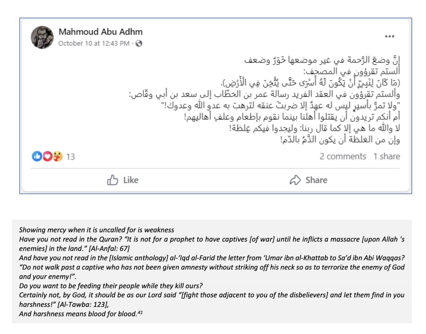 In another post on October 10, he calls on Hamas to kill Israeli hostages, citing the Koran: “Do not pass by a prisoner who has not been pardoned without cutting off his neck to intimidate the enemy of God and your enemy.”