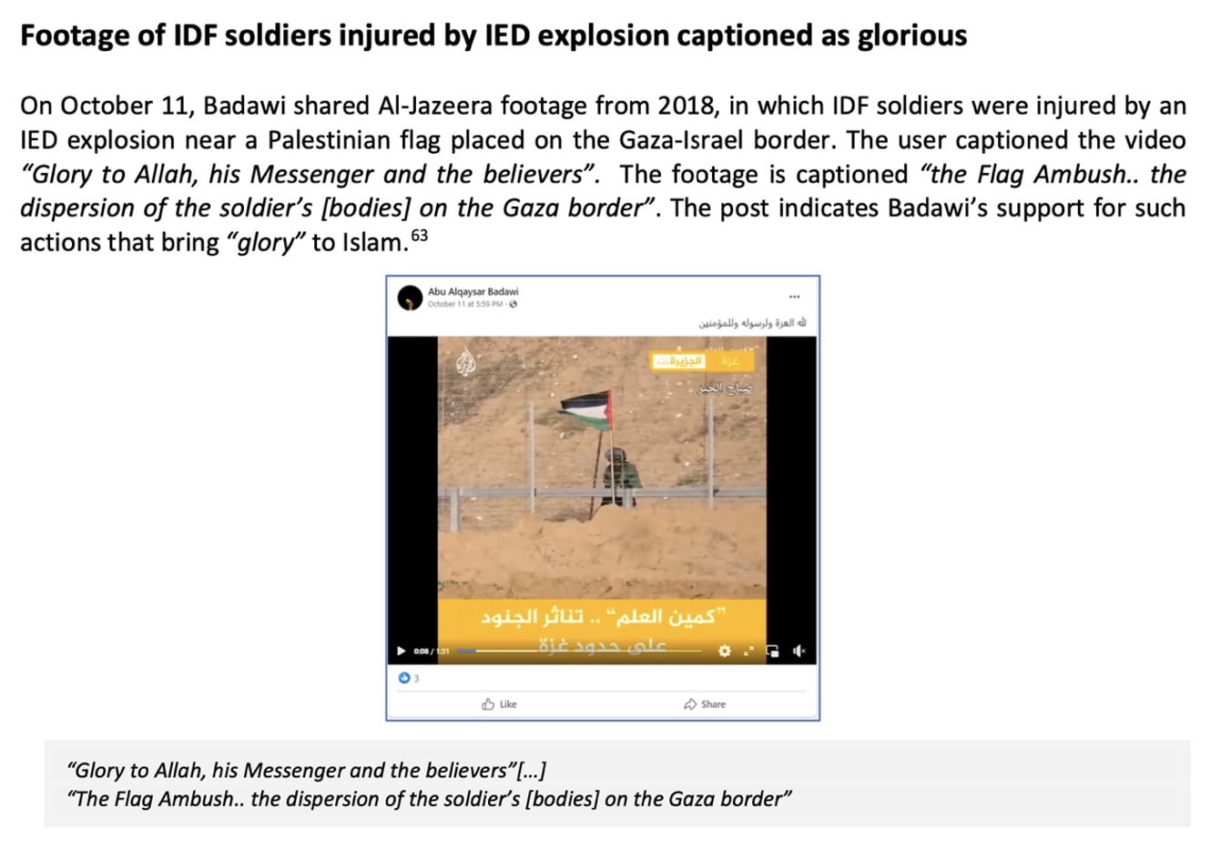 Abu Alqaysar Badawi, like his wife, is an UNRWA teacher from Ramallah. On October 11, he published an Al Jazeera channel video from 2018 showing IDF soldiers injured in an explosion near a Palestinian flag placed on the Gaza-Israel border. He accompanied the footage with the caption, “Praise be to Allah, His Messenger, and the believers.”