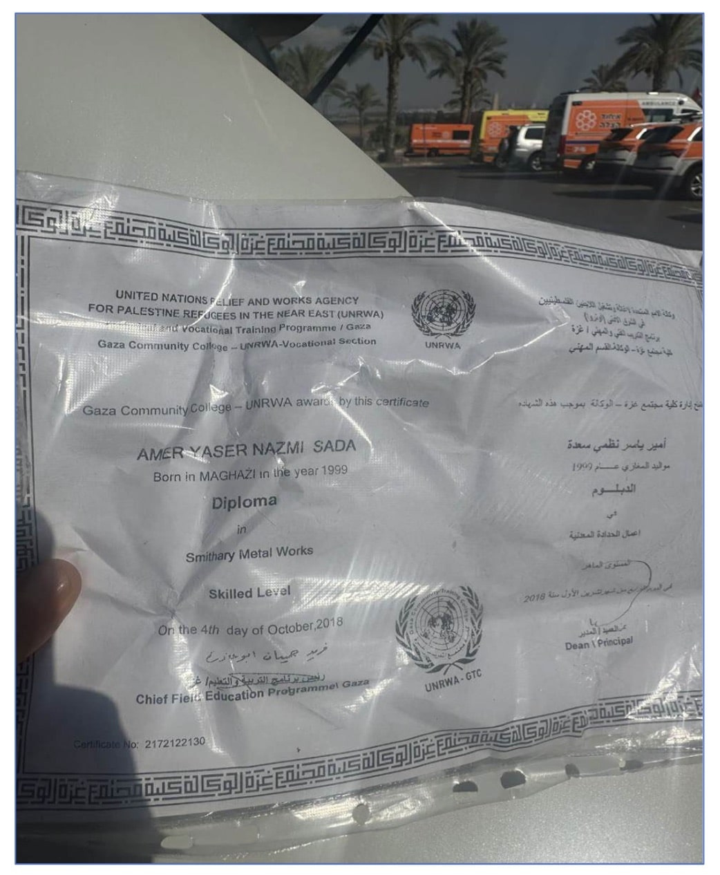 A 2018 diploma from UNRWA College in Gaza was found in the car of one of the terrorists involved in the October 7 attack.