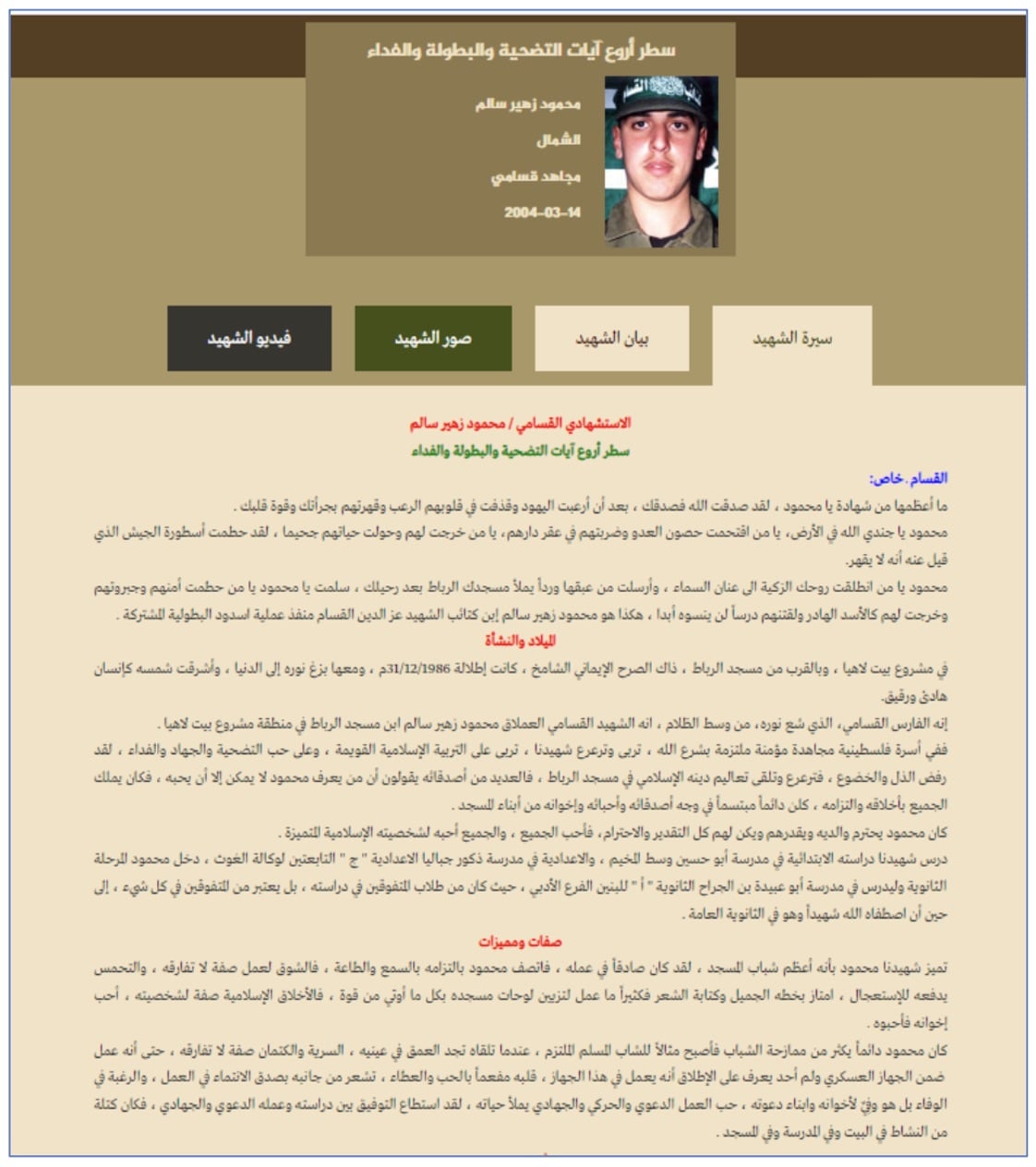 Mahmoud Zuhair Salem is also listed on the website of Hamas’ military wing, the Al-Qassam Brigades. His biography states, “he was taught to love jihad and self-sacrifice.” The former UNRWA school student was one of the organizers of the 2004 Ashdod port bombings that killed 16 Israelis. He was only 18 years old at the time.