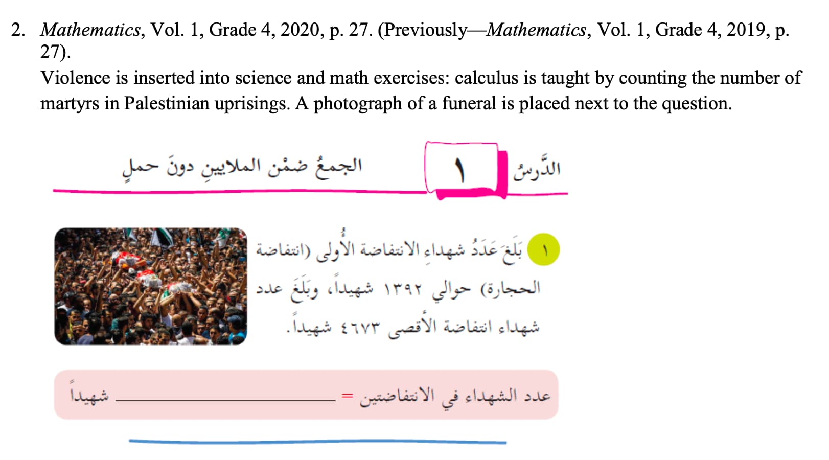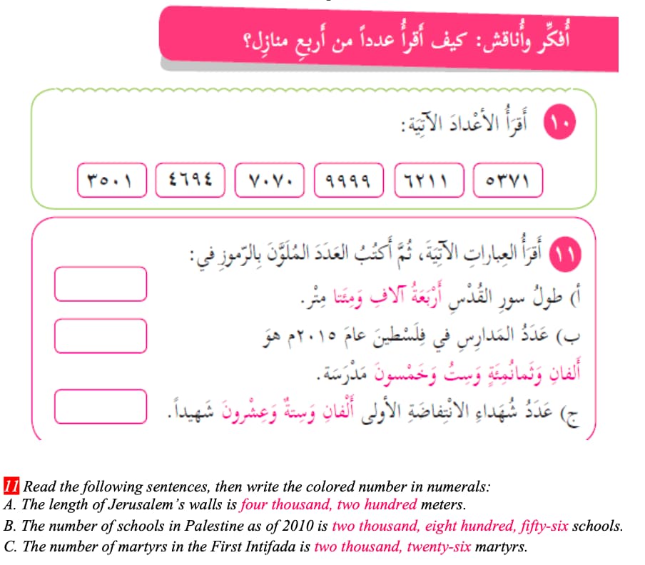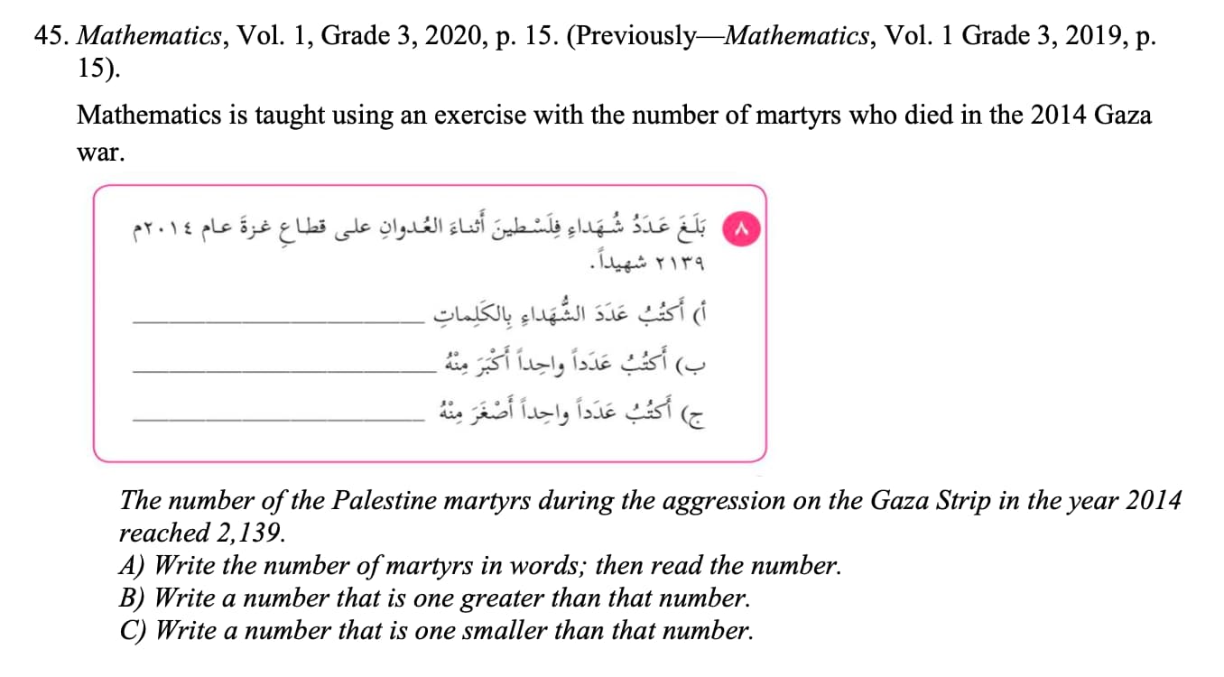Pupils are taught numbers, and in one assignment, they are asked to choose the correct number of “martyrs of the First Intifada” from the options provided.