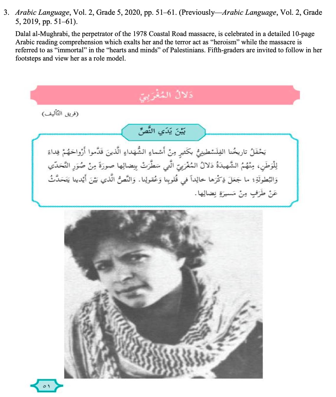 The textbook glorifies Dalal al-Mughrabi, who carried out the terror bus hostage-taking in 1978 that killed 38 Israelis and wounded 72.