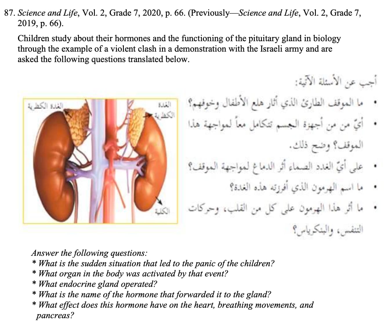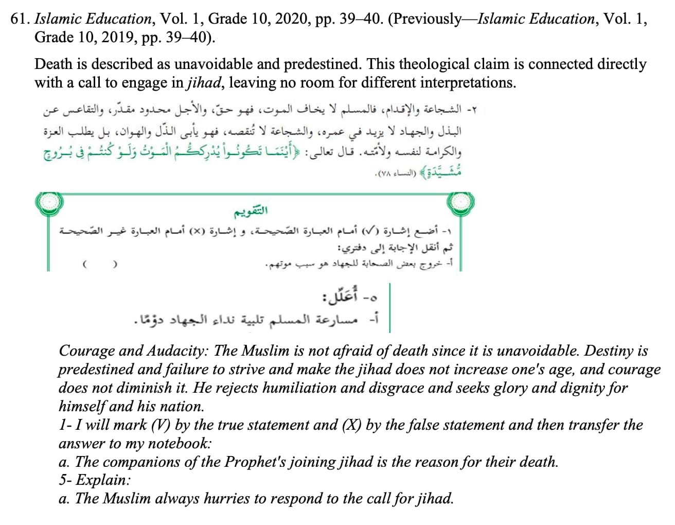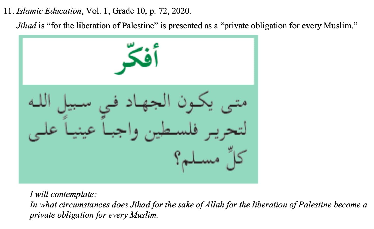 The textbook invites reflection on the topic of when jihad for the liberation of Palestine becomes the duty of every Muslim.