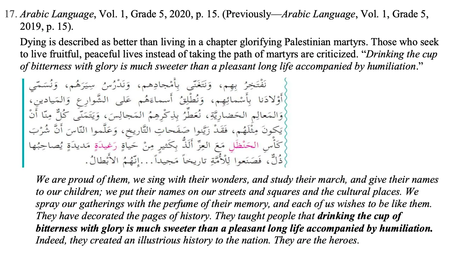 Death is described as better than life in the chapter glorifying the Palestinian martyrs. Those who seek to live fruitful, peaceful lives instead of following the path of the martyrs are criticized. “To drink the cup of bitterness with glory is far sweeter than a pleasant long life accompanied by humiliation.”
