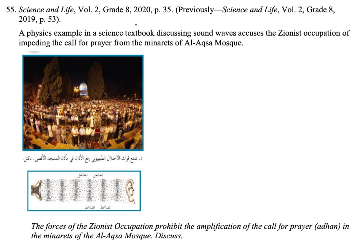 The textbook cites a photograph of the Hasan Beck Mosque in modern Tel Aviv as an illustration of the Palestinian city of Jaffa, which “Arab ancestors built 6,000 years ago.”