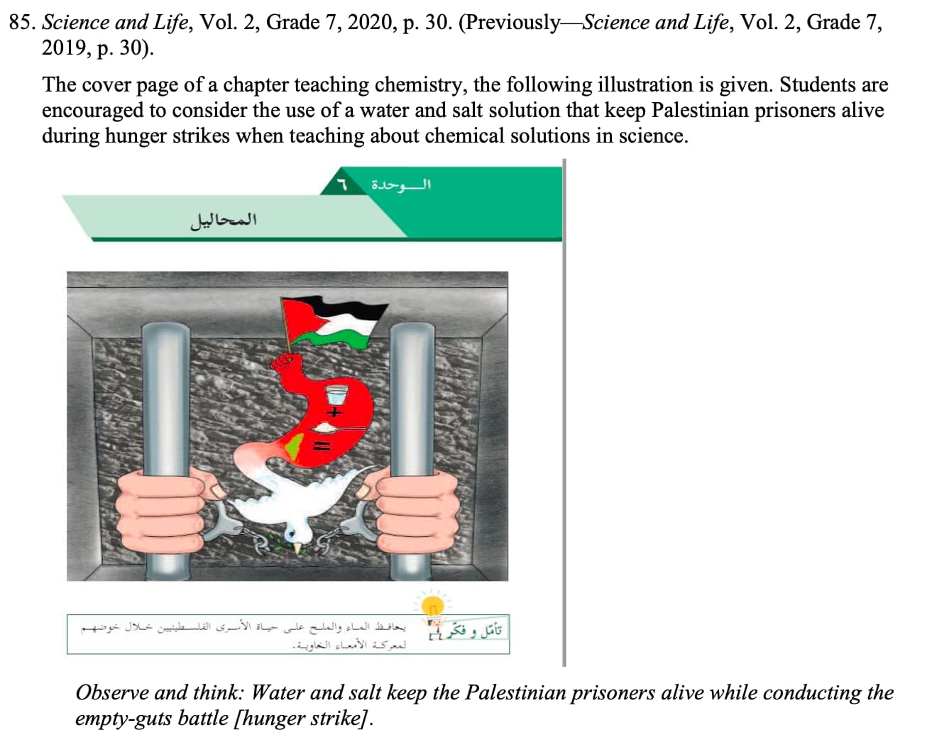 The report gives many examples of impressive passages about human rights, tolerance, and acceptance of the other. As for the examples highlighted in the IMPACT-se reports, GEI also publishes plenty of them but reaches quite the opposite conclusions. For instance, the study identifies examples of confrontation with the Israeli army in science textbooks as a legitimate practice of using real-life examples in education. The report’s findings give a rather vague or non-existent assessment of the glorification of martyr culture, notions of jihad, and ignoring the existence of Israel.
