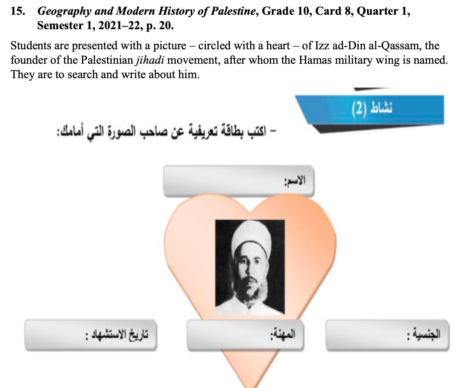 The textbook contains a heart-circled picture of Izz al-Din al-Qassam, the founder of the jihadist movement, after whom the military wing of Hamas is named. Students are asked to find information about him and write in the appropriate fields, e.g., “date of martyrdom.”