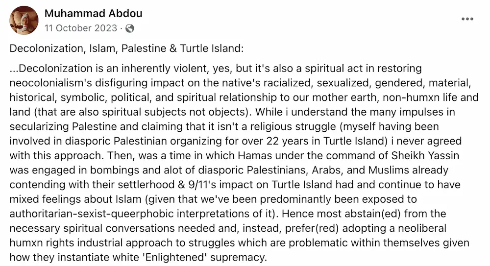 Just invited Dr. Mohamed Abdo, in his Facebook post on October 11, while criticizing Islamists for their radical position on LGBTQ issues, nevertheless supports, albeit violent, but necessary actions of ‘resistance’ for ‘decolonization’ and even expresses solidarity ‘to a certain extent’ with Hamas, Hezbollah, and Islamic Jihad.